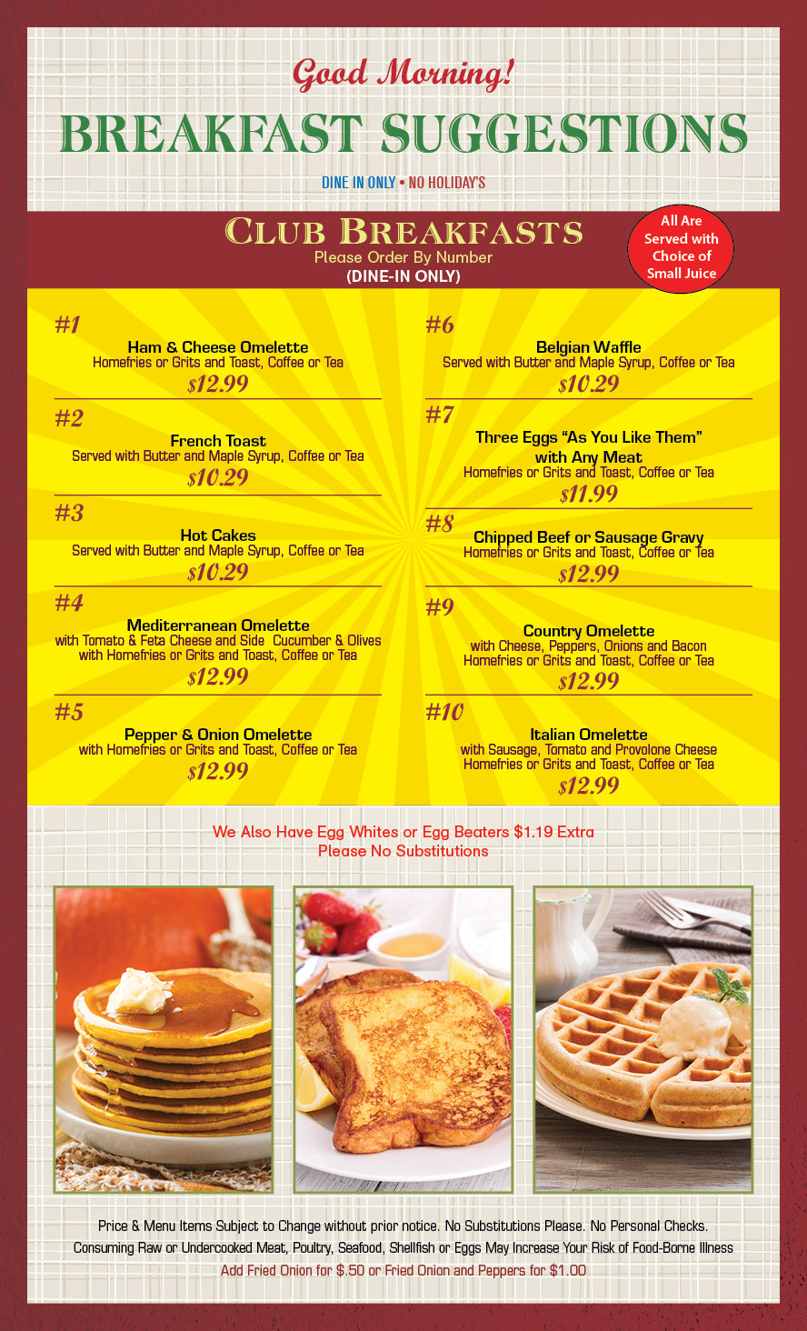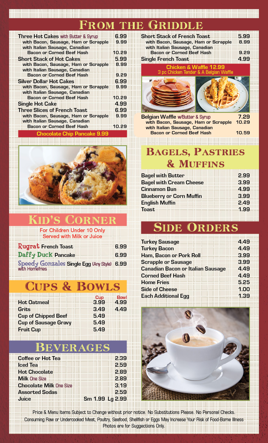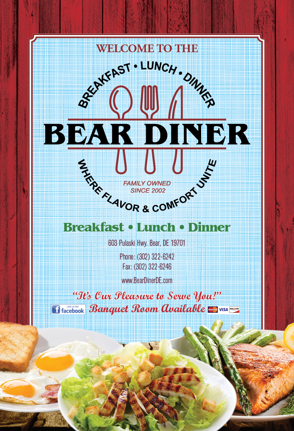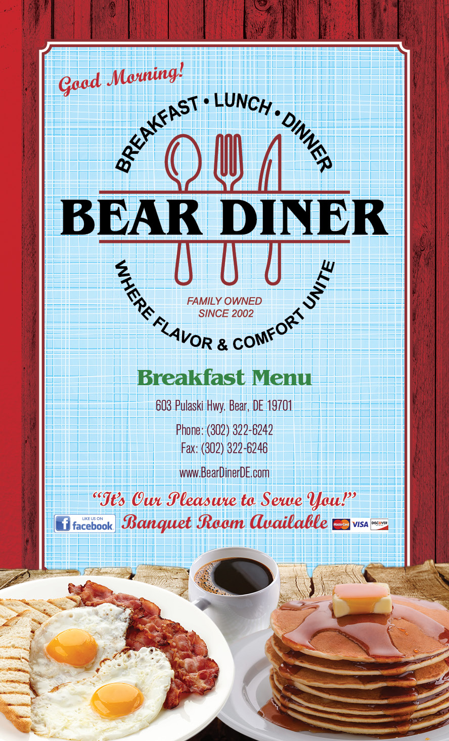 Our Menu Click Dots to change pages Address 603 Pulaski Hwy. Bear, DE 19701 Order Takeout 302-322-6242 } Our Hours Everyday: 6am-9pm Our Specials Dinner Menu Breakfast Menu Come Visit Us! 603 Pulaski Hwy. Bear, DE 19701